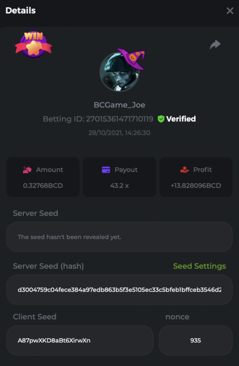 7. HALLOWEEN SLOT BATTLE Starts: 26, October 14:00 GMT Ends: 2, November 14:00 GMT Welcome back, to celebrate this Halloween season we have a spook-filled BGaming Halloween slot battle for you this week, with a total prize pool of $4,000! What's the Challenge? BGaming Multiplier battle - Get the highest multiplier on any of the 4 BGaming slots below Lucky Dama Muerta Spin & Spell Candy Monsta Fruit Million - Halloween Edition 1 prize per slot, awarded to the person with the highest multiplier on each of the 4 games above Each winner must be unique - meaning 4 prizes given to 4 separate people - you cannot win more than one prize! In the event that someone does post winning entries for more than 1 slot, the entry with the highest multiplier will be valid - all other entries will be disregarded and the prize will be awarded to the next valid entry. Minimum VIP Tier Must be VIP4 or higher in order to enter this challenge. Minimum Bet Size Lucky Dama Muerta - $0.20 Spin & Spell - $0.20 Candy Monsta - $0.20 Fruit Million - Halloween Edition - $0.20 Eligible Coins All coins are eligible (excluding JB) Available Prizes Lucky Dama Muerta - Highest Multi......$1,000 Spin & Spell - Highest Multi.....$1,000 Candy Monsta - Highest Multi....$1,000 Fruit Million - Highest Multi......$1,000 How to Enter To enter, copy the bet ID of the bet you'd like to submit Once you've copied it, post it as a reply to this thread like so: Betting ID: 1708854428417660423 In the same post, upload a screenshot of your win by clicking the game ID WITH VIEW IN USD mode ENABLED (accessible at the bottom of dropdown menu for your wallet up top. This way, we can ensure that your bet indeed met the minimum requirement at the time of placing it: